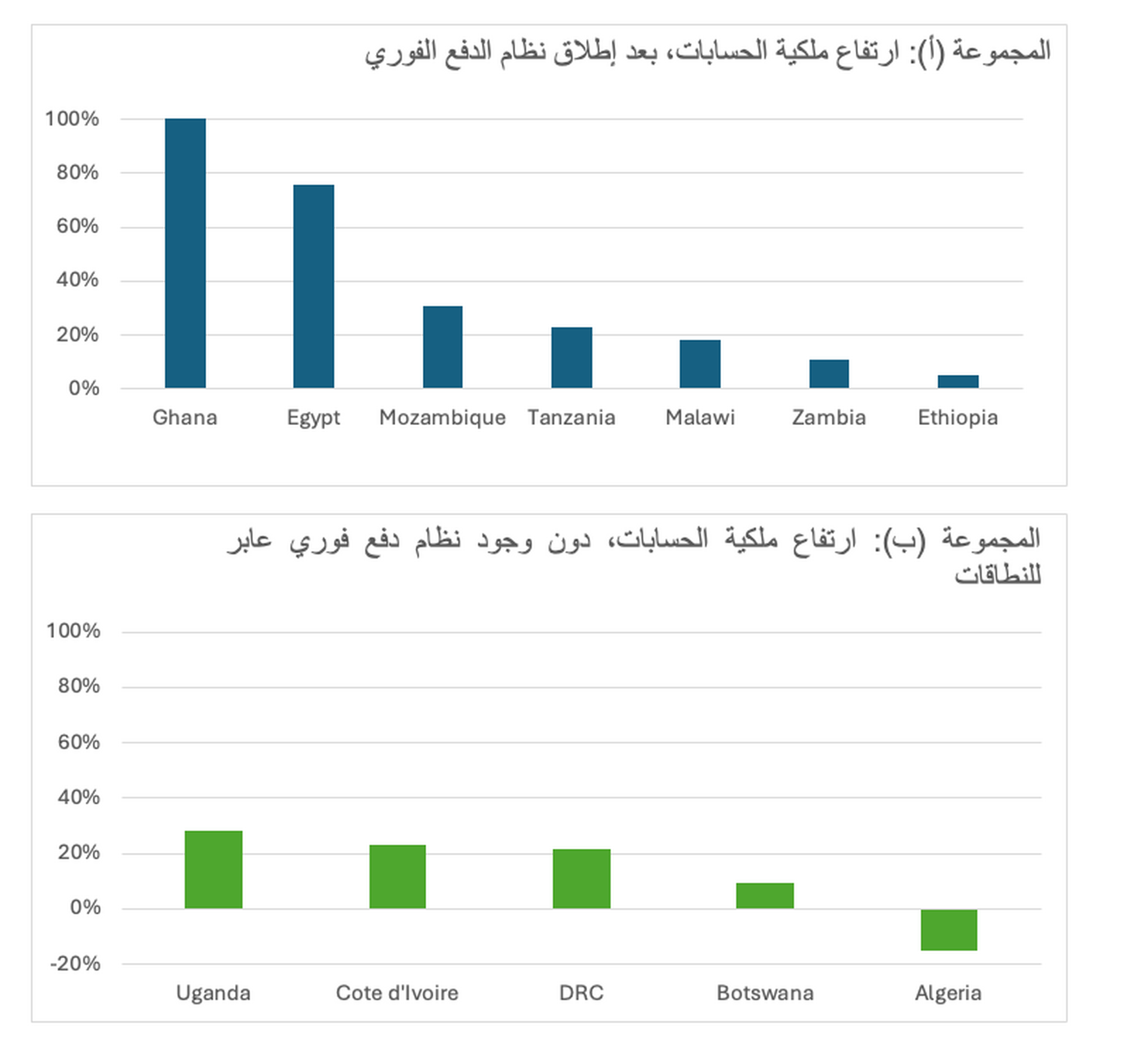 وشهدت بعض البلدان التي ليس لديها نظام دفع فوري عابر للنطاقات نموًا في ملكية الحسابات على قدم المساواة مع بلد من البلدان التي لديها هذا النظام أو أكثر، ومنها على سبيل المثال جمهورية الكونغو الديمقراطية وأوغندا، وكلاهما يتمتعان بأسواق خدمات مالية عبر الهاتف المحمول متنامية، وهو الأمر الذي قد يفسر الزيادات في ملكية الحسابات والمدفوعات لديهما حتى في غياب نظام الدفع الفوري العابر للنطاقات.