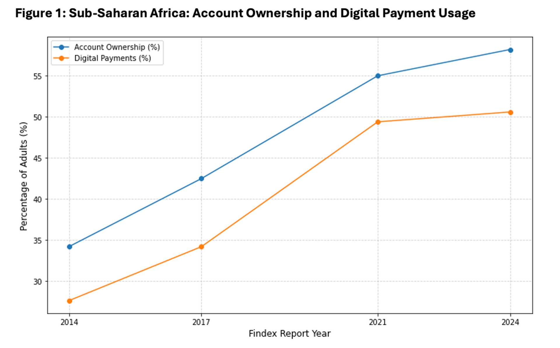 جاء إطلاق قاعدة بيانات الشمول المالي في العالم لعام 2025 ليبشر مؤيدي الشمول المالي في مختلف أنحاء أفريقيا؛ فوفقًا للبيانات الجديدة (انظر الشكل 1)، ارتفعت نسبة البالغين في أفريقيا جنوب الصحراء الكبرى الذين يملكون حسابًا مصرفيًا أو حساب خدمات مالية عبر الهاتف المحمول من 34% إلى 58% خلال الفترة الممتدة من 2014 إلى 2024. وهذا يُظهر أن ما يقارب 6 من مجموع 10 أفراد بات لديهم حساب مالي.