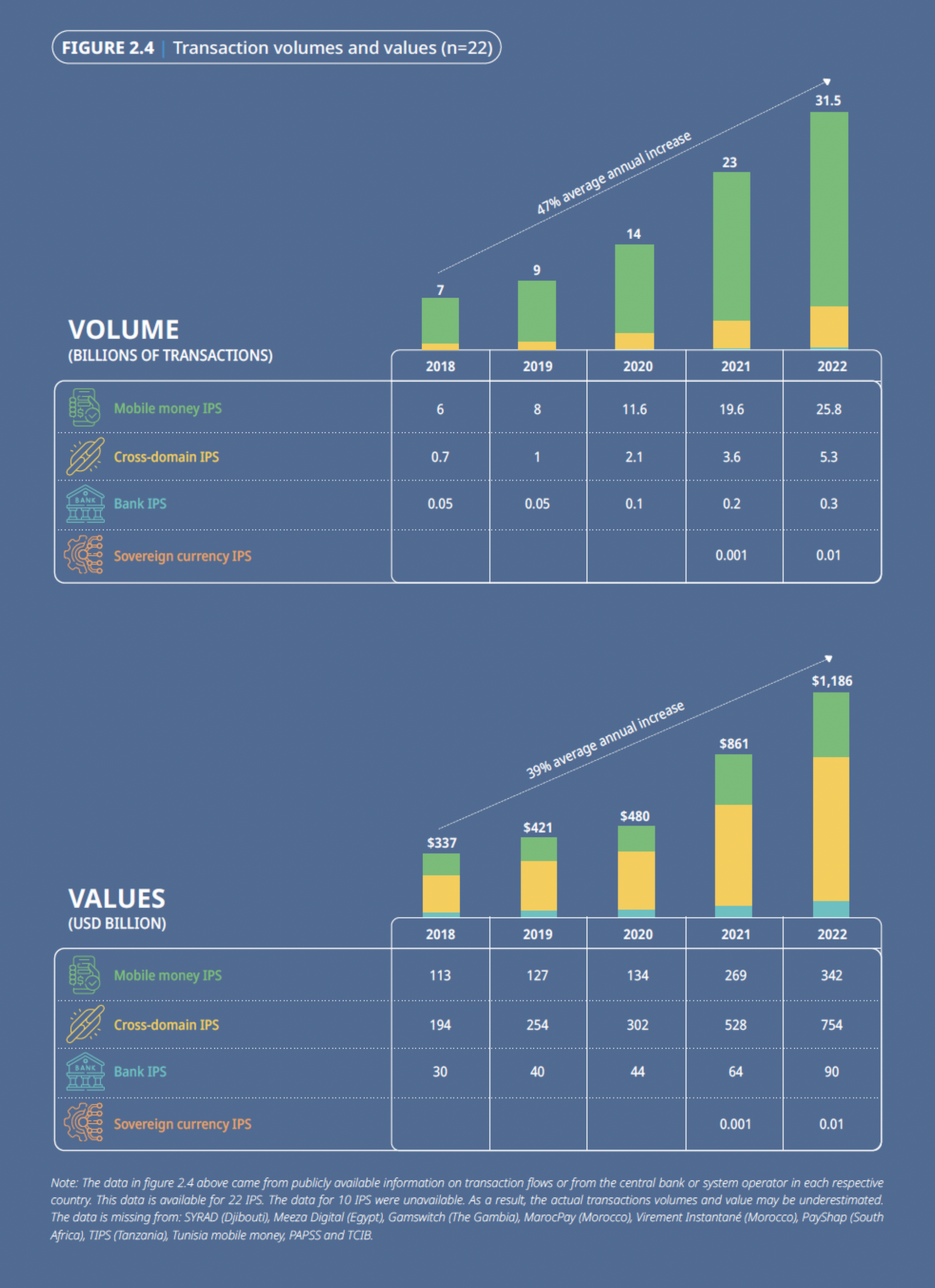 IPS are public or public-private sector payment platforms capable of processing retail payments from any financial provider in real-time and 24/7. The 32 IPS in Africa processed nearly 32 billion transactions worth close to $1.2 trillion in 2022, as reported in the AfricaNenda State of Inclusive Instant Payment Systems in Africa Report, 2023. The volume and value of payments made by IPS to date represent massive progress from ten years ago.