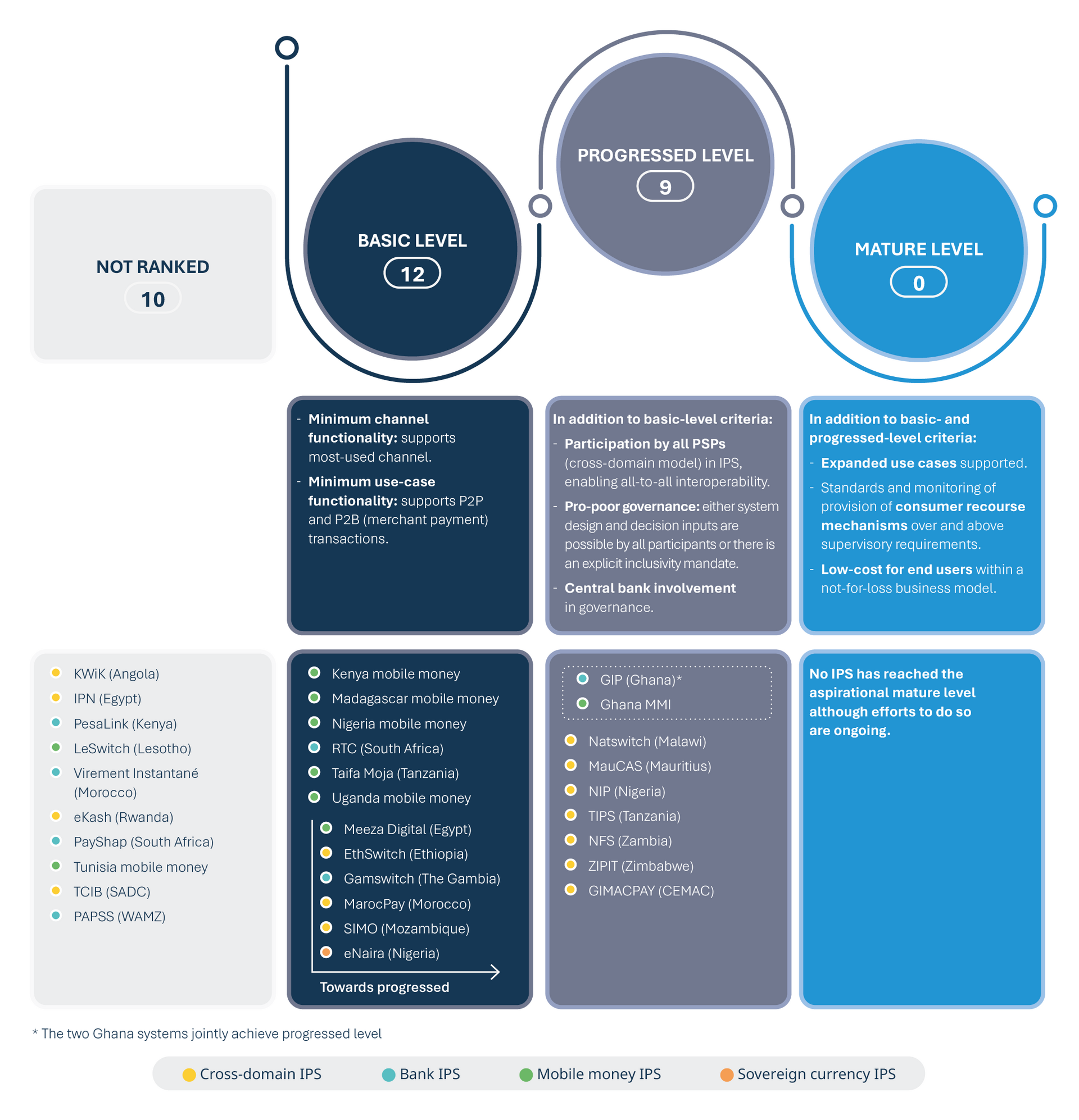 Progressed: In addition to the basic level criteria, these IPS allow all payment service providers to participate (enabling all-to-all interoperability and enabling more use cases), the system is informed by pro-poor governance, and there’s central bank involvement.