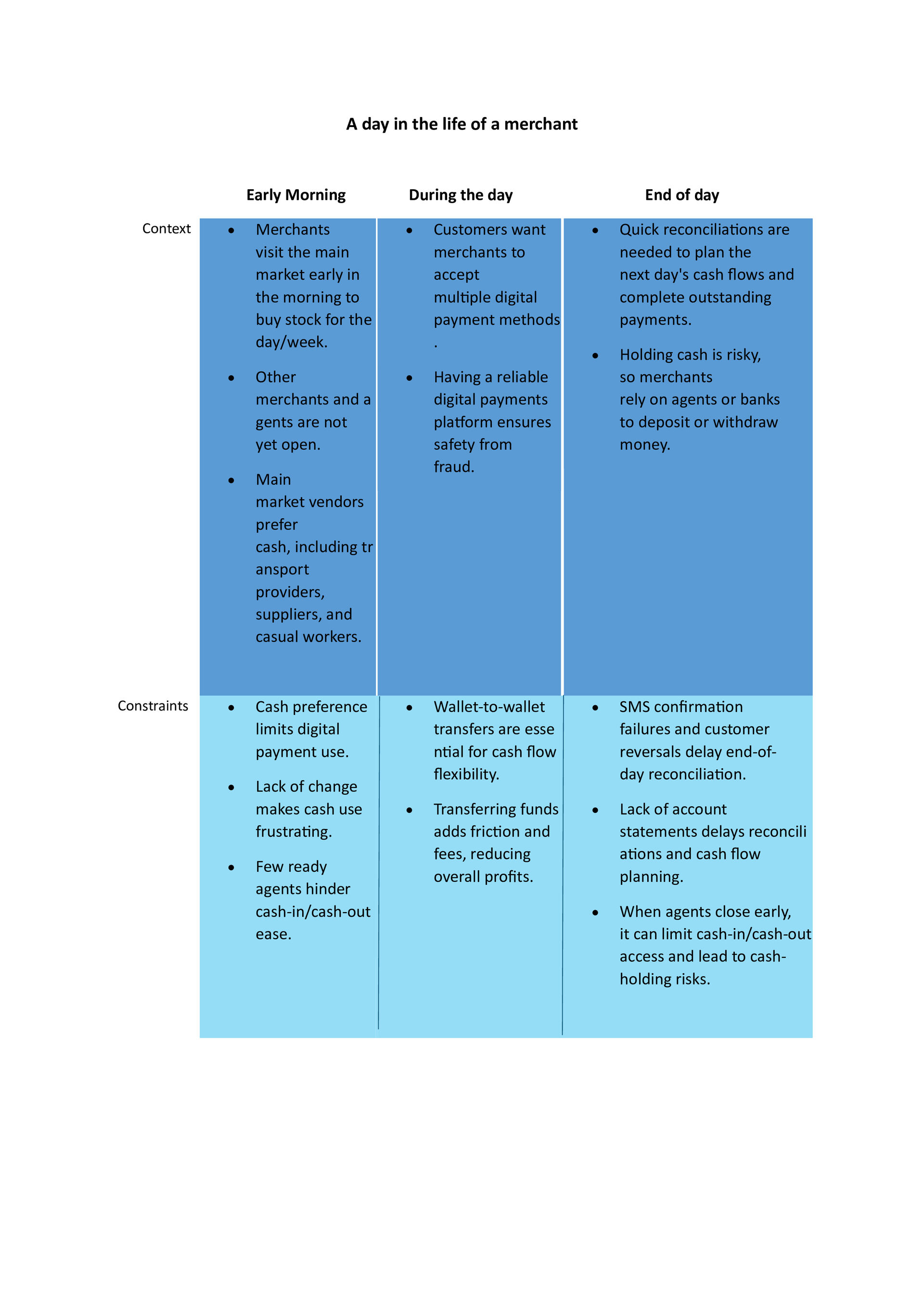 Merchants in fragmented ecosystems face inconsistent experiences across platforms. This may take the form of unexpected fees, unreliable transaction confirmation of flows, or recourse, especially during peak hours. Interoperability of payment services will bring more convenience to merchants, strengthening the overall value proposition of digital payments. When agents are not nearby or lack float, merchants are unable to convert cash to digital value or vice versa. Therefore, having well-resourced agents within reach is also critical.