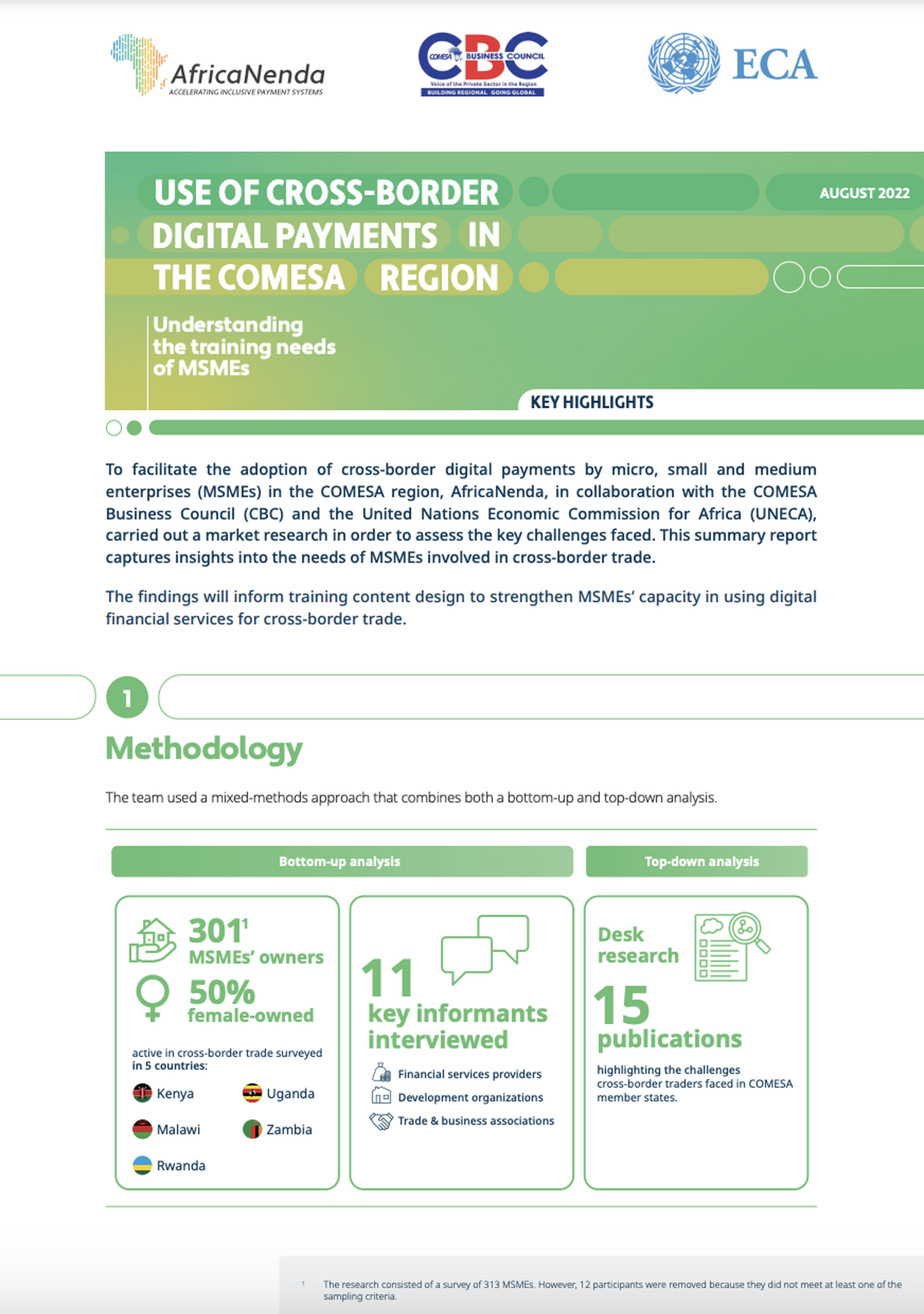 To facilitate the adoption of cross-border digital payments by micro, small and medium enterprises (MSMEs) in the COMESA region, AfricaNenda, in collaboration with the COMESA Business Council (CBC) and the United Nations Economic Commission for Africa (UNECA), carried out a market research in order to assess the key challenges faced. This summary report captures insights into the needs of MSMEs involved in cross-border trade.