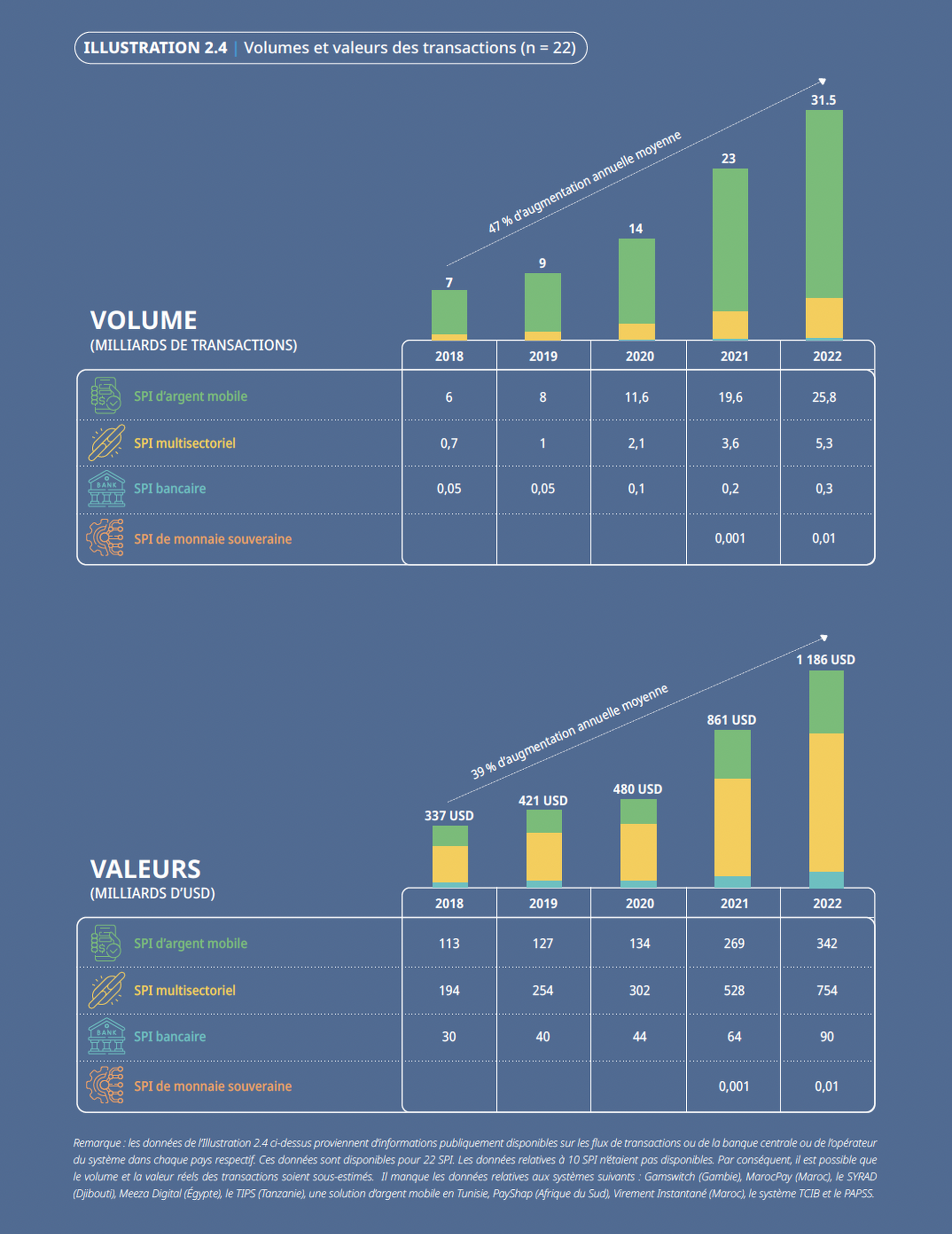 Les SPI sont des plateformes de paiement du secteur public ou public-privé capables de traiter les paiements de détail de n’importe quel fournisseur financier en temps réel, et ce 24 heures sur 24, 7 jours sur 7. En 2022, les 32 SPI que compte l’Afrique ont traité près de 32 milliards de transactions, pour un montant total de pas moins de 1 200 milliards de dollars, comme l’indique le Rapport sur l’état des lieux des systèmes de paiement instantané inclusifs d’AfricaNenda. Le volume et la valeur des paiements traités via des SPI à ce jour sont les témoins des progrès considérables réalisés par rapport à la situation d’il y a dix ans.
