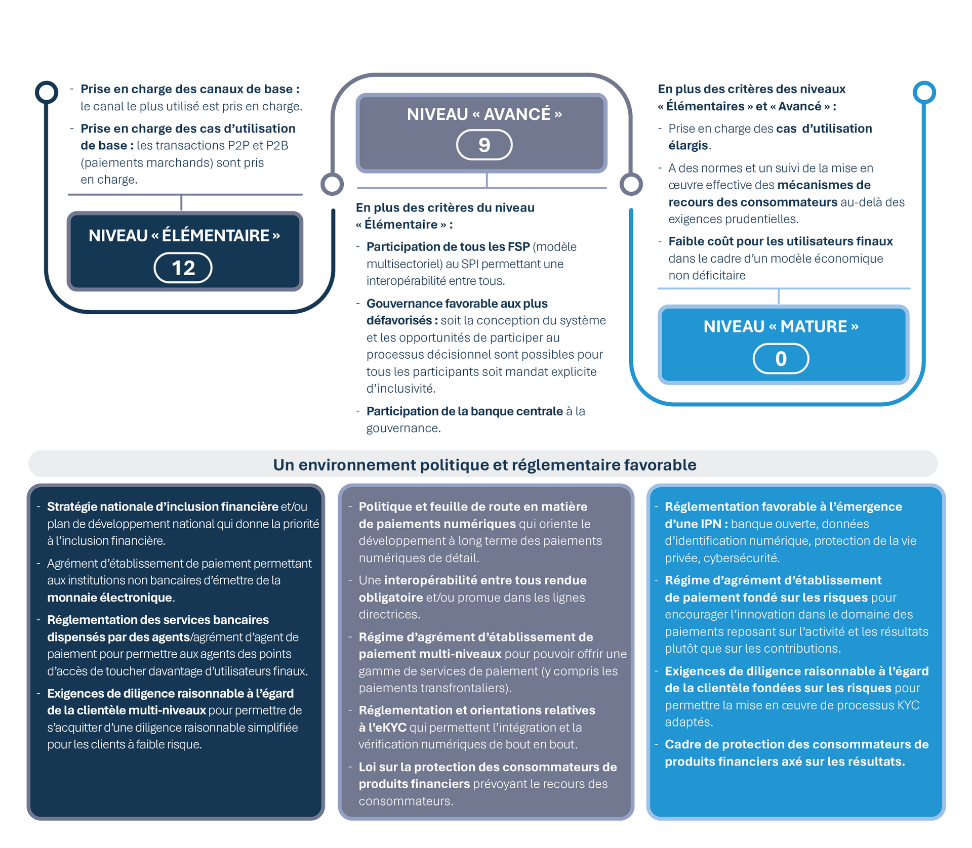- Avancé : en plus des critères du niveau précédent, un SPI de niveau avancé doit être ouvert à l’ensemble des FSP agréés – y compris les banques, les entités non bancaires et les fintechs. Il créé ainsi une plateforme multisectorielle véritablement interopérable qui permet à chaque utilisateur final d’en payer n’importe quel autre, quel que soit le type de compte détenu ou auprès de quel fournisseur ce dernier est détenu. Ce niveau exige aussi une gouvernance favorable aux plus défavorisés, avec une implication active de la banque centrale pour préserver les objectifs de politique publique et garantir que tous les participants – bancaires et non bancaires – puissent peser dans la conception du système.
