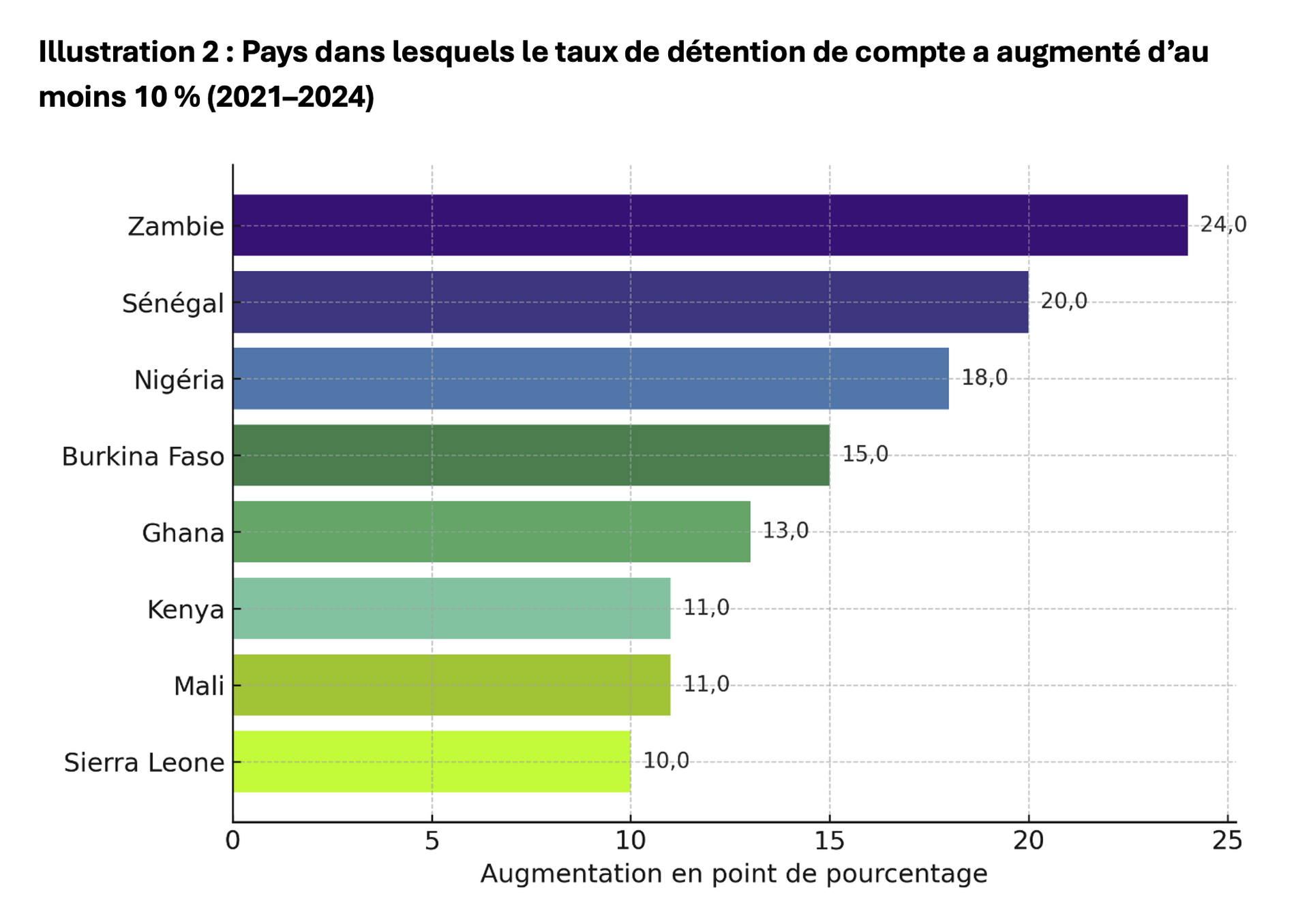 Rien que sur les trois dernières années, le taux de détention de compte a progressé d’au moins 10 points de pourcentage dans huit économies, dont trois (Nigéria, Sénégal, Zambie) qui ont observé une hausse de 20 points de pourcentage ou davantage (voir Illustration 2)[1].
