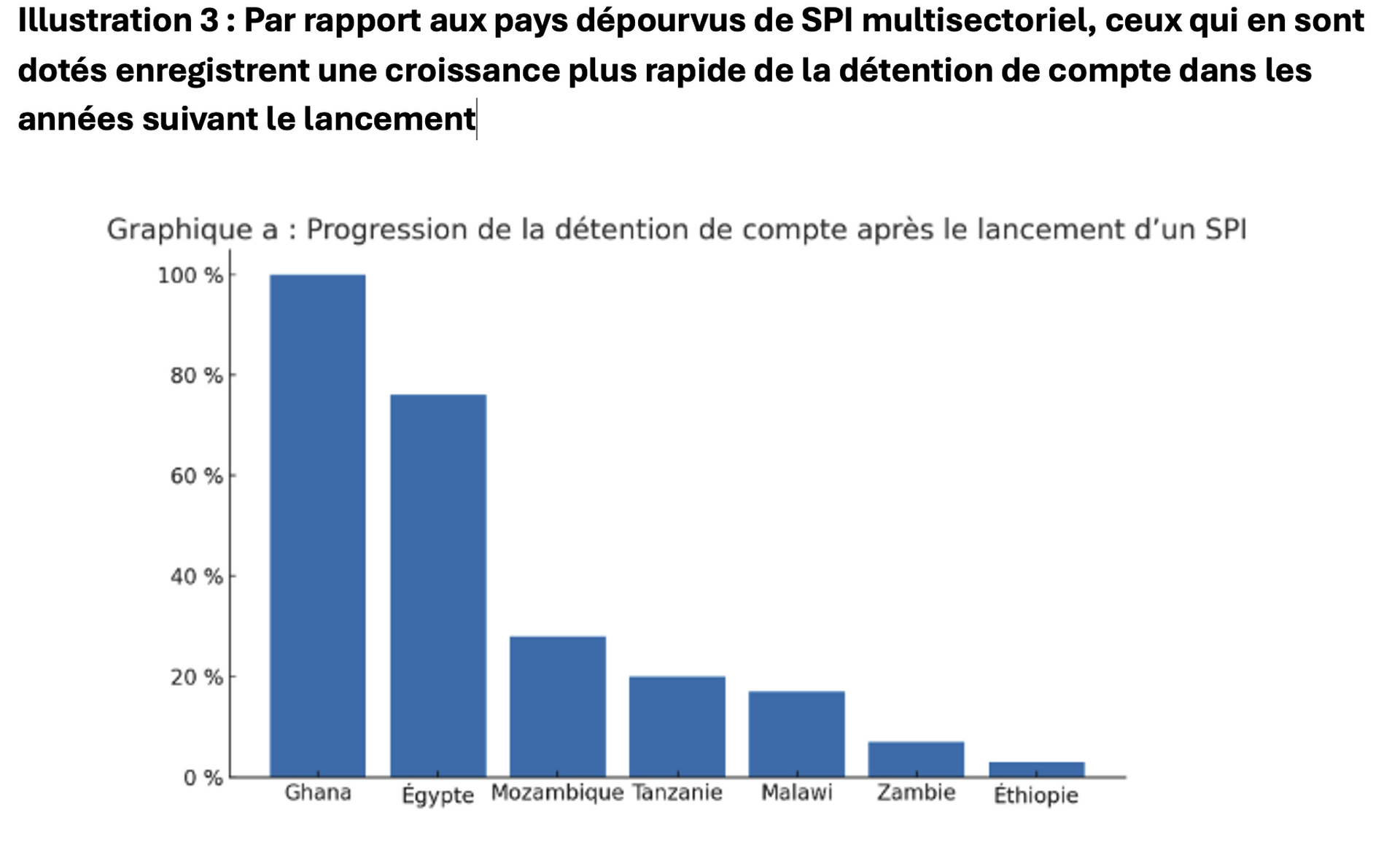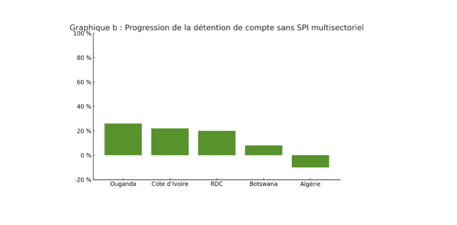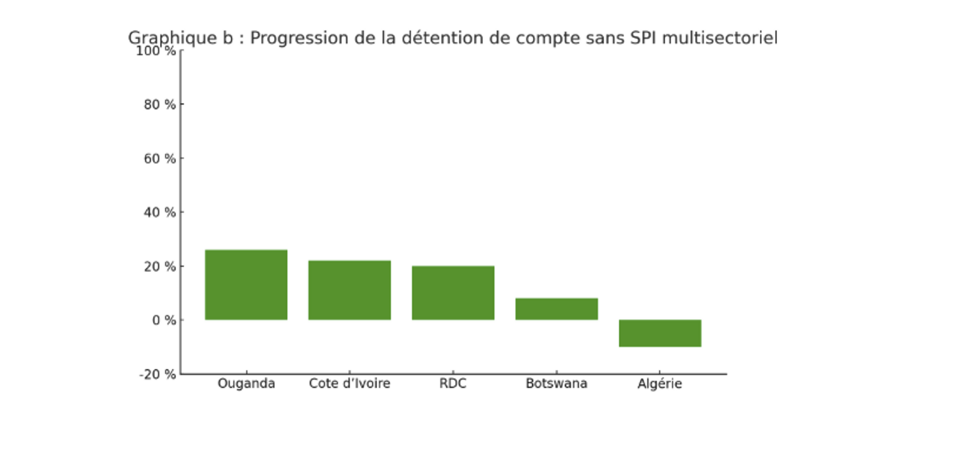 Parallèlement, certains des pays sans SPI multisectoriel ont affiché une progression équivalente à celle de certains pays dotés d’un ou plusieurs SPI. C’est le cas notamment de la République démocratique du Congo et de l’Ouganda, tous deux portés par la croissance rapide de leurs marchés d’argent mobile, ce qui peut expliquer leurs avancées en matière de détention de compte et d’adoption des paiements numériques même en l’absence de SPI multisectoriel.