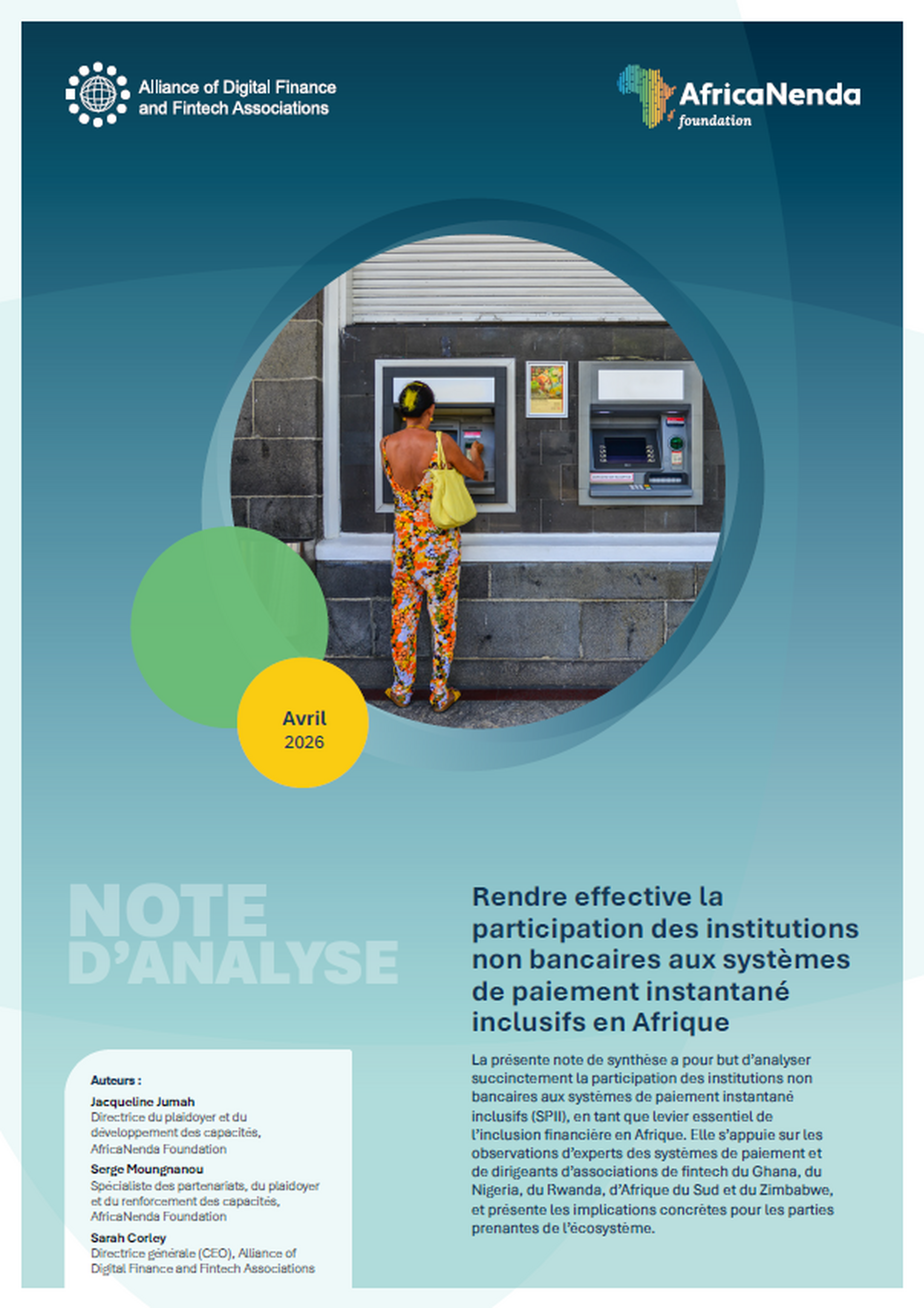 Le paysage des systèmes de paiement instantané (SPI) en Afrique reste largement dominé par les systèmes interdomaines : 18 des 36 SPI nationaux et régionaux sont classés comme interdomaines, selon le rapport « État des systèmes de paiement instantané inclusifs (SIIPS) 2025 ». Cette note de synthèse examine la participation des acteurs non bancaires aux systèmes de paiement instantané inclusifs (SPIi) en tant que facteur clé de l’inclusion financière en Afrique. Elle s’appuie sur les analyses de praticiens des systèmes de paiement et de dirigeants d’associations fintech au Ghana, au Nigéria, au Rwanda, en Afrique du Sud et au Zimbabwe, et présente les implications pour les parties prenantes de l’écosystème. AfricaNenda Foundation et Alliance of Digital Finance and Finteh Associations (AllianceDFA) remercient sincèrement les associations fintech nationales et les représentants du secteur qui ont contribué à ce travail. Nous remercions tout particulièrement les associations fintech du Ghana, du Nigéria, du Rwanda, d’Afrique du Sud et du Zimbabwe pour leur participation à la table ronde de septembre 2025 sur le développement de la participation des acteurs non bancaires aux systèmes de paiement instantané inclusifs en Afrique.